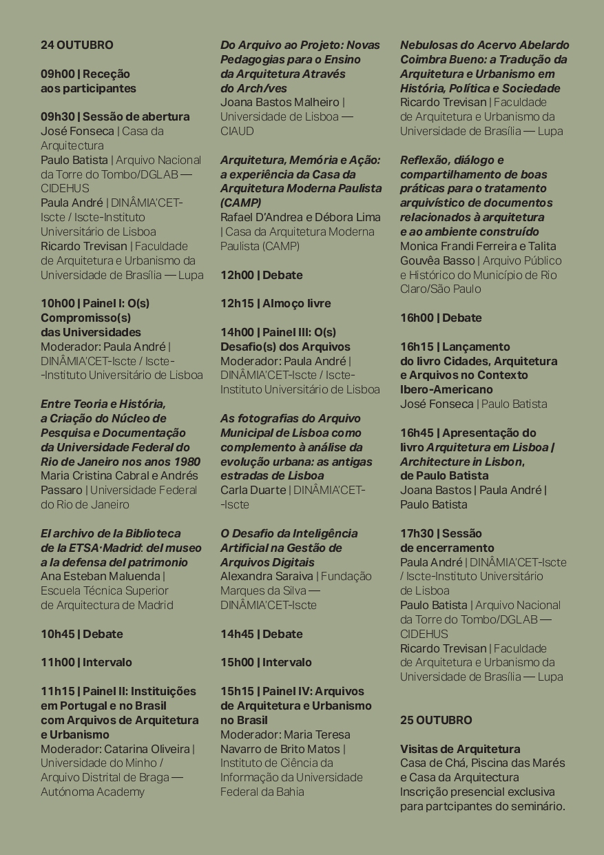 O 7º Encontro Cidades, Arquitectura e Arquivos em contexto Ibero-Americano, coordenado por Paula André (DINÂMIA'CET-Iscte), Paulo Batista (Arquivo Nacional da Torre do Tombo/ DGLAB-CIDEHUS) e Ricardo Trevisan (Faculdade de Arquitetura e Urbanismo da Universidade de Brasília), terá lugar nos dias 24 e 25 de outubro, na Casa da Arquitectura, em Matosinhos.