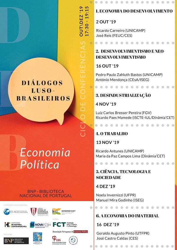 De 2 de outubro a 16 de dezembro, a Biblioteca Nacional de Portugal acolhe o ciclo de conferências "Diálogos Luso-Brasileiros", que colocam 'mano-a-mano' investigadores de referência, um português e um brasileiro, em torno de problemas centrais, teóricos e empíricos, da Economia Política Contemporânea. Esta iniciativa é coorganizada pelo Centro de Estudos sobre África e Desenvolvimento (CEsA) do Instituto Superior de Economia e Gestão (ISEG) da Universidade de Lisboa, Centro de Estudos sobre a Mudança Socioeconómica e o Território (DINÂMIA'CET) do Instituto Universitário de Lisboa (ISCTE), Instituto de História Contemporânea (IHC) da Faculdade de Ciências Sociais e Humanas (FCSH) da Universidade Nova de Lisboa; apoiada da pelo Doutoramento interinstitucional de Economia Política (ULisboa, ISCTE e ISEG) e pelo Mestrado em Políticas de Desenvolvimento dos Recursos Humanos (ISCTE/IUL), pela Fundação para a Ciência e Tecnologia (FCT), Associação Portuguesa de Economia Política, Centro de Estudos Sociais (CES) da Universidade de Coimbra e ISCTE; em parceria com o BNP e Casa da América Latina. O ISEG estará representado na sessão de dia 16 de outubro, pelo professor António Mendonça, que irá falar sobre "Desenvolvimentismo e Neo-Desenvolvimentismo"; e, no dia 4 de dezembro, pelo professor Manuel Mira-Godinho, que abordará a temática da "Ciência, Tecnologia e Sociedade".